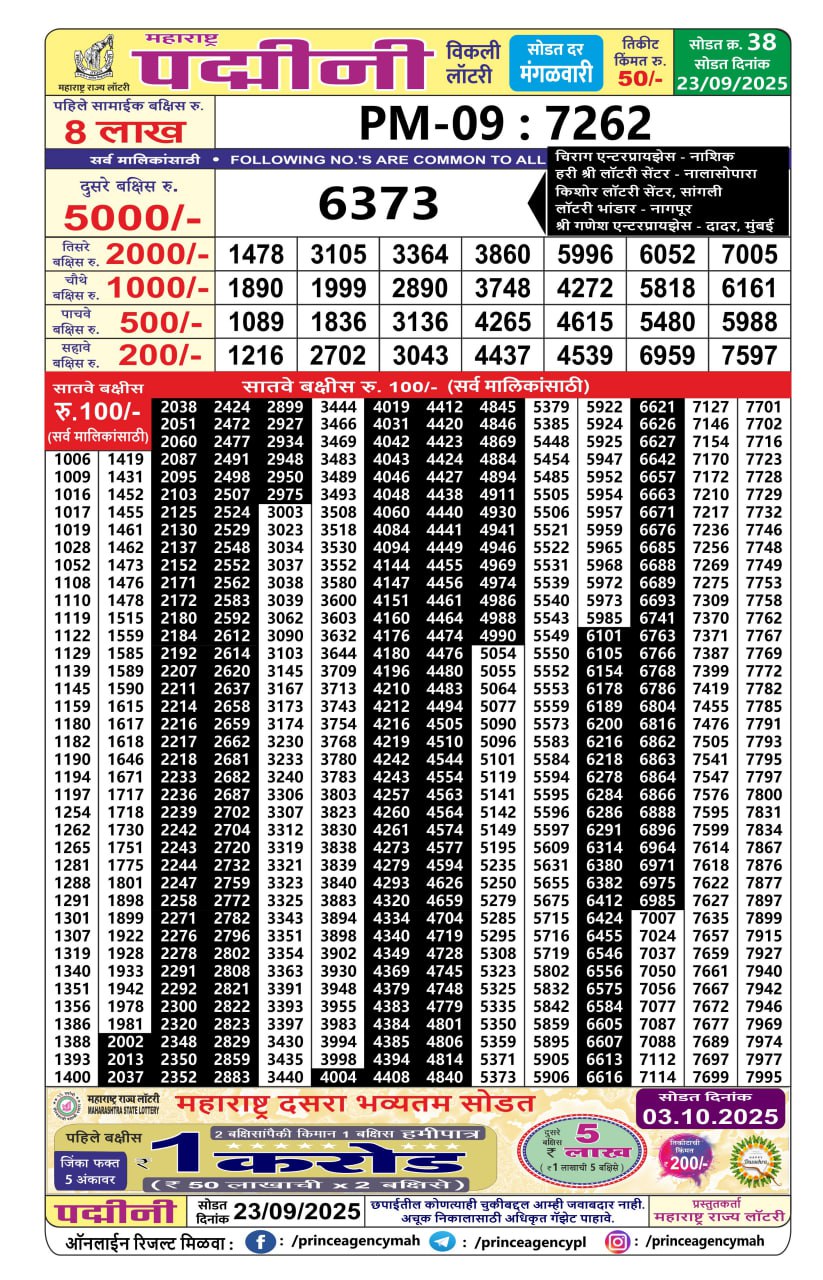 Maharashtra Padmini weekly lottery result 23/09/25 23/09/25 Leave a Comment on Maharashtra Padmini weekly lottery result 23/09/25 Share: XFacebookPinterestRedditVKDiggLinkedinMix Related Articles 0 84 Maharashtra Ganesh laxmi lottery result 17/4/25 0 88 Maharashtra Padmini weekly lottery result 14/10/25 0 59 Maharashtra ganeshlaxmi monthly lottery result 17/5/25 0 68 Maharashtra Ganesh laxmi lottery result 15/4/25