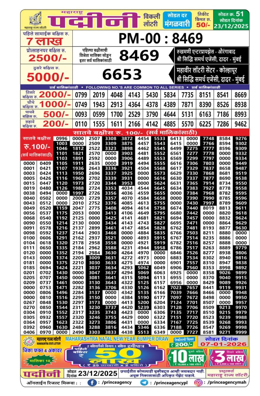 Maharashtra Padmini Weekly lottery result 23/12/25 23/12/25 Leave a Comment on Maharashtra Padmini Weekly lottery result 23/12/25 Share: XFacebookPinterestRedditVKDiggLinkedinMix Related Articles 0 232 Maharashtra GaneshLaxmi Diwali Special Monthly Draw Result 1 415 Maharashtra Diwali Bumper Lottery Draw Result 01/11/25 0 365 Maharashtra Padmini weekly lottery result 16/09/25 0 223 Maharashtra Padmini weekly lottery result 25/11/25