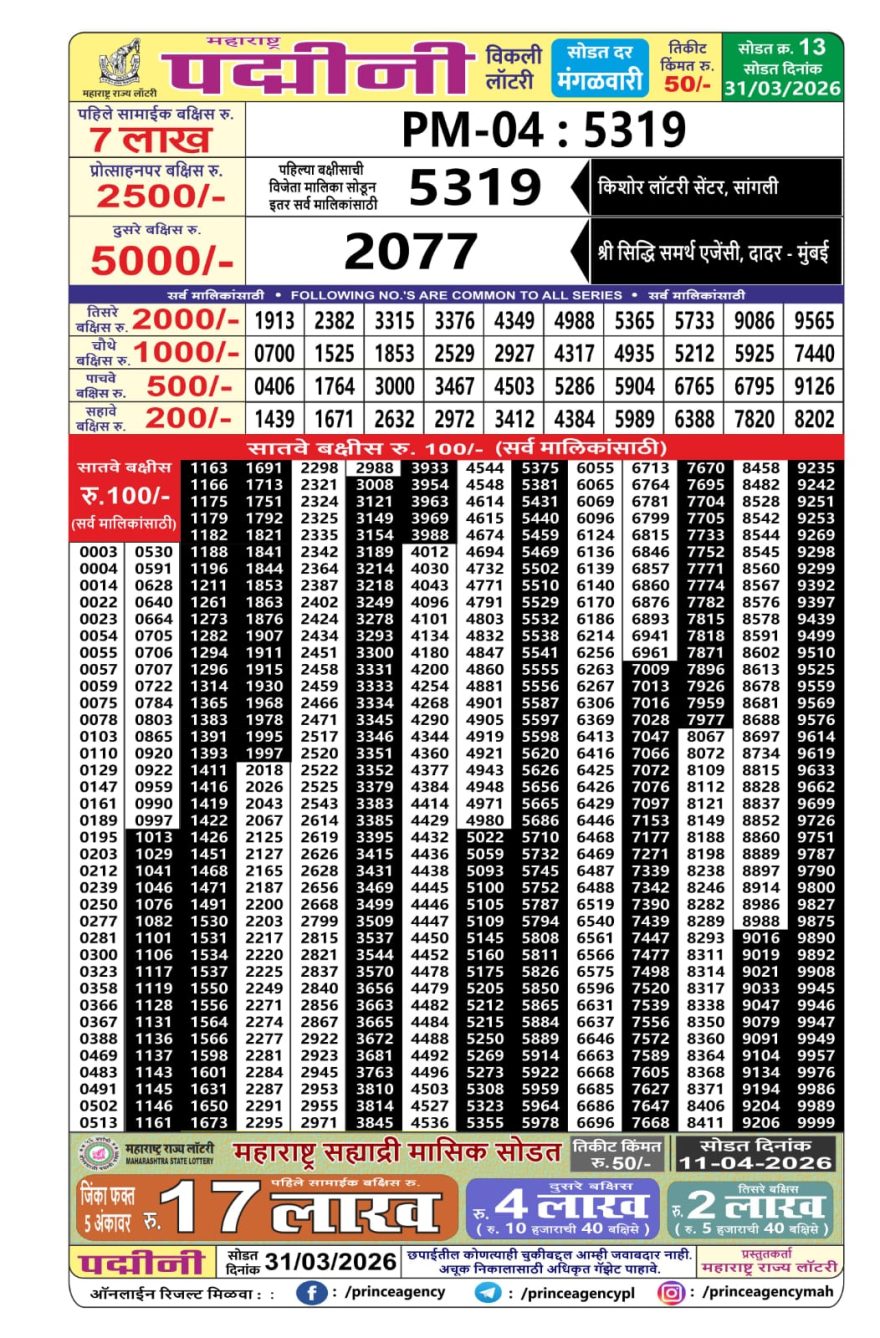 Maharashtra Padmini Weekly lottery result 31/03/26 31/03/26 Leave a Comment on Maharashtra Padmini Weekly lottery result 31/03/26 Share: XFacebookPinterestRedditVKDiggLinkedinMix Related Articles 0 210 Maharashtra Laxmi Weekly Lottery Result 31/01/26 0 155 Maharashtra Vaibhav Laxmi Weekly Lottery Result 11/07/25 0 346 Maharashtra Vaibhav Laxmi Weekly Lottery Result 20/02/26 0 196 Maharashtra Akarshak Weekly Lottery Result 11/12/25