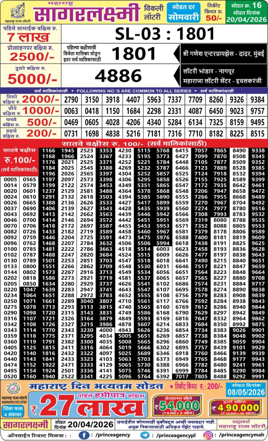 Maharashtra Sagar Laxmi weekly lottery result 20/04/2026 20/04/26 Leave a Comment on Maharashtra Sagar Laxmi weekly lottery result 20/04/2026 Share: XFacebookPinterestRedditVKDiggLinkedinMix Related Articles 0 267 Maharashtra Laxmi Weekly Lottery Result 31/05/25 0 208 Maharashtra Akshay Weekly Lottery Result 28/01/26 0 267 Maharashtra Vaibhav Laxmi Weekly Lottery Result 31/10/25 0 340 Maharashtra Sagar Laxmi weekly lottery result 29/09/2025