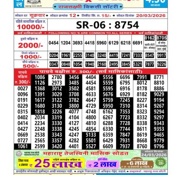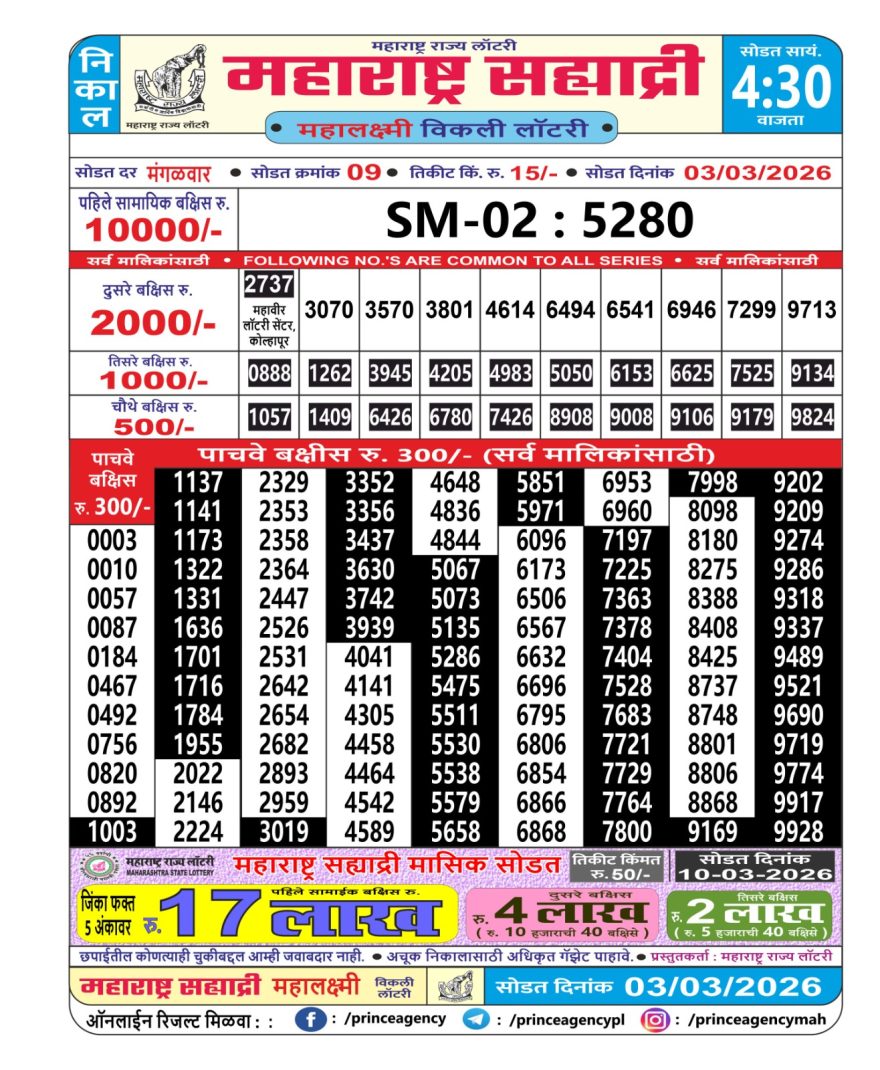 Maharashtra Sahyadri Weekly Lottery Result 03/03/26 03/03/26 Leave a Comment on Maharashtra Sahyadri Weekly Lottery Result 03/03/26 Share: XFacebookPinterestRedditVKDiggLinkedinMix Related Articles 0 168 Maharashtra Sahyadri Weekly Lottery Result 13/08/25 0 326 Maharashtra Sahyadri Weekly Lottery Result 20/03/26 0 167 Maharashtra Mohini Lottery Result 08/06/25 0 179 Maharashtra Sahyadri Weekly Lottery Result 22/01/26