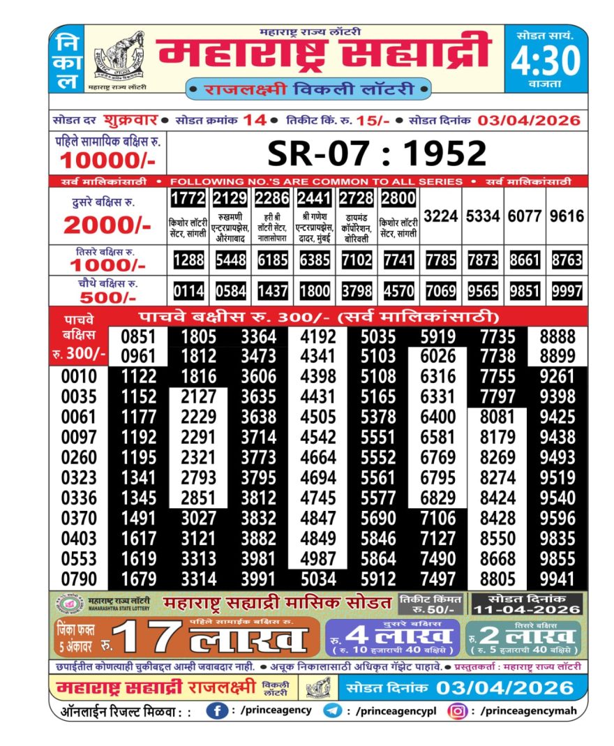Maharashtra Sahyadri Weekly Lottery Result 03/04/26 03/04/26 Leave a Comment on Maharashtra Sahyadri Weekly Lottery Result 03/04/26 Share: XFacebookPinterestRedditVKDiggLinkedinMix Related Articles 0 165 Maharashtra Sahyadri Weekly Lottery Result 18/08/25 0 184 Maharashtra Sahyadri Weekly Lottery Result 04/02/26 0 180 Maharashtra Sahyadri weekly lottery result 16/4/25 0 280 Maharashtra Sahyadri Weekly Lottery Result 11/09/25