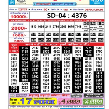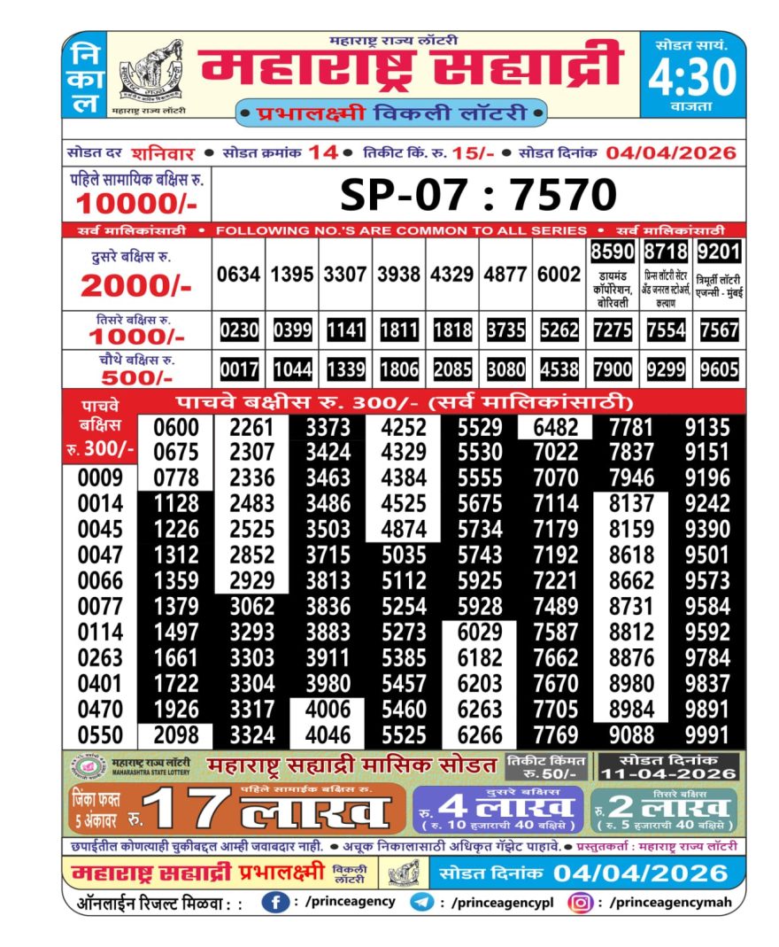 Maharashtra Sahyadri Weekly Lottery Result 04/04/26 04/04/26 Leave a Comment on Maharashtra Sahyadri Weekly Lottery Result 04/04/26 Share: XFacebookPinterestRedditVKDiggLinkedinMix Related Articles 0 197 Maharashtra Sahyadri Weekly Lottery Result 29/12/25 0 179 Maharashtra Sahyadri Weekly Lottery Result 20/01/26 0 205 Maharashtra Mohini Lottery Result 23/11/25 0 248 Maharashtra Sahyadri Weekly Lottery Result 05/03/26