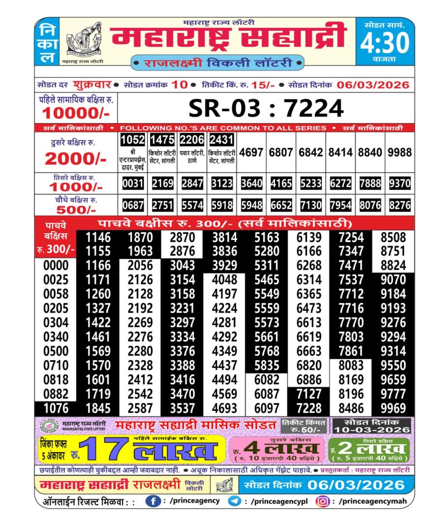 Maharashtra Sahyadri Weekly Lottery Result 06/03/26 06/03/26 Leave a Comment on Maharashtra Sahyadri Weekly Lottery Result 06/03/26 Share: XFacebookPinterestRedditVKDiggLinkedinMix Related Articles 0 165 Maharashtra Mohini Lottery Result 01/02/26 0 221 Maharashtra Sahyadri Weekly Lottery Result 13/11/25 0 219 Maharashtra Sahyadri weekly lottery result 5/4/25 0 214 Maharashtra Sahyadri Weekly Lottery Result 19/12/25