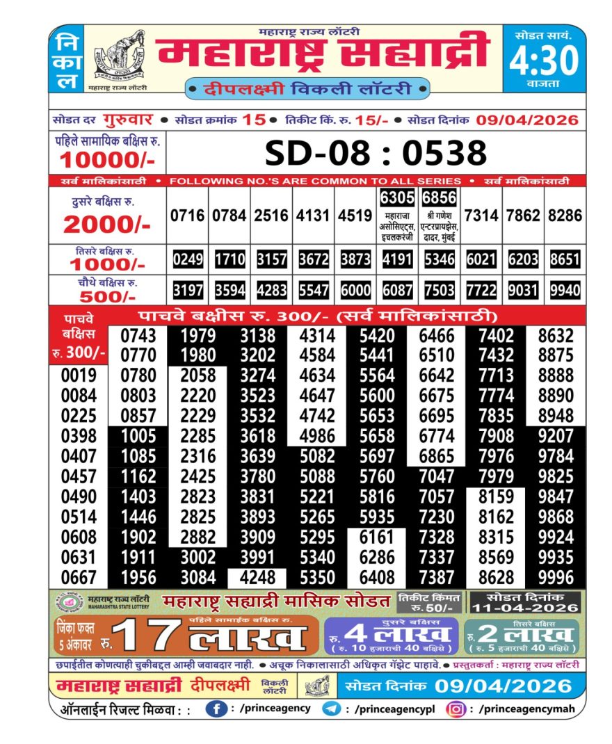Maharashtra Sahyadri Weekly Lottery Result 09/04/26 09/04/26 Leave a Comment on Maharashtra Sahyadri Weekly Lottery Result 09/04/26 Share: XFacebookPinterestRedditVKDiggLinkedinMix Related Articles 0 240 Maharashtra Sahyadri Weekly Lottery Result 31/12/25 0 244 Maharashtra Sahyadri Weekly Lottery Result 19/09/25 0 167 Maharashtra Sahyadri Lottery Result 3/3/25 0 277 Maharashtra Mohini Lottery Result 05/10/25