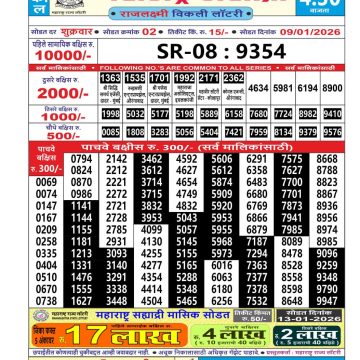 Maharashtra Sahyadri Weekly Lottery Result 12/01/26 12/01/26 Leave a Comment on Maharashtra Sahyadri Weekly Lottery Result 12/01/26 Share: XFacebookPinterestRedditVKDiggLinkedinMix Related Articles 0 200 Maharashtra Sahyadri Weekly Lottery Result 01/10/25 0 118 Maharashtra Mohini Lottery Result 24/08/25 0 126 Maharashtra Mohini Lottery Result 09/11/25 0 67 Maharashtra Sahyadri Weekly Lottery Result 09/01/26