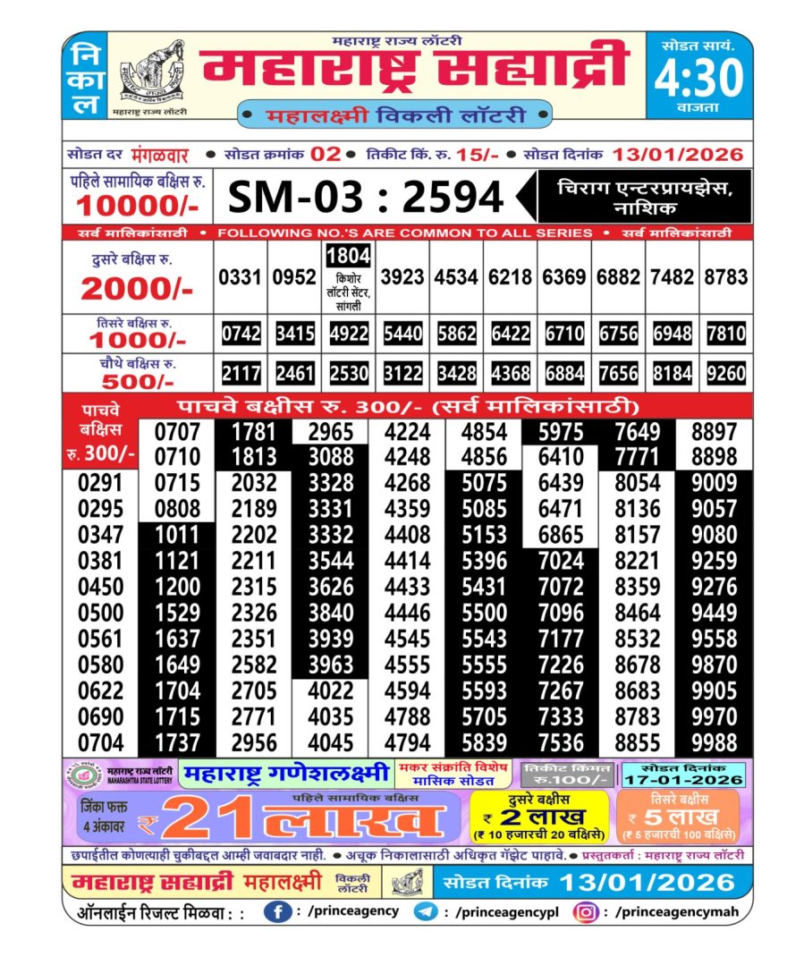 Maharashtra Sahyadri Weekly Lottery Result 13/01/26 13/01/26 Leave a Comment on Maharashtra Sahyadri Weekly Lottery Result 13/01/26 Share: XFacebookPinterestRedditVKDiggLinkedinMix Related Articles 0 139 Maharashtra Sahyadri Weekly Lottery Result 10/06/25 0 135 Maharashtra Sahyadri Weekly Lottery Result 03/09/25 0 82 Maharashtra Sahyadri Lottery Result 10/3/25 0 113 Maharashtra Sahyadri Weekly Lottery Result 18/12/25