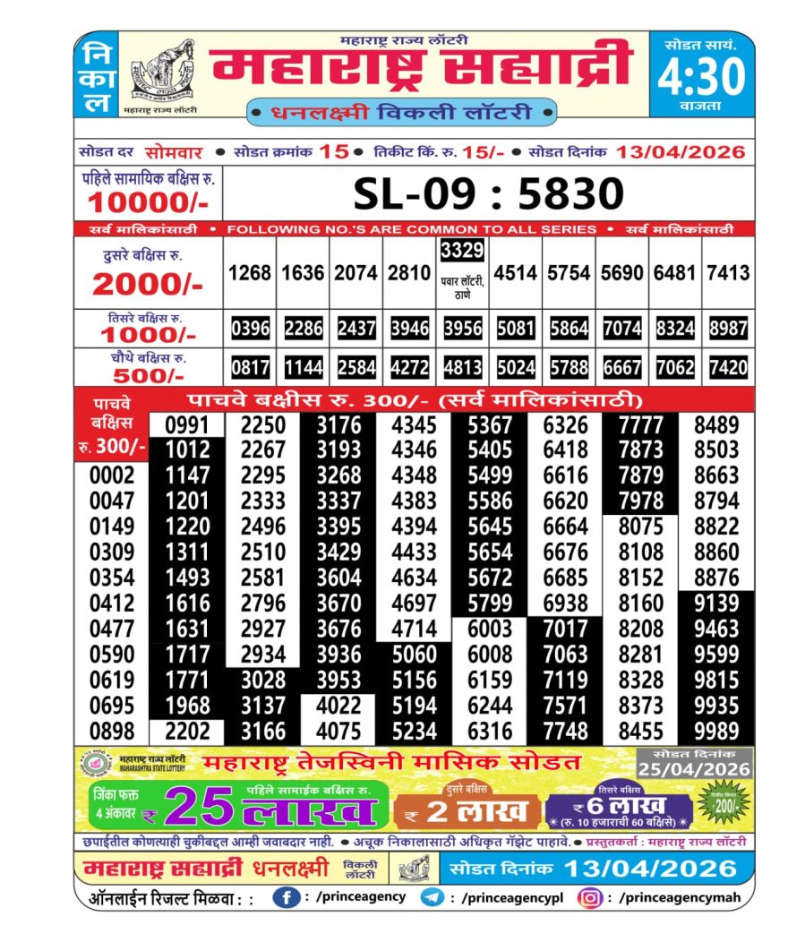Maharashtra Sahyadri Weekly Lottery Result 13/04/26 13/04/26 Leave a Comment on Maharashtra Sahyadri Weekly Lottery Result 13/04/26 Share: XFacebookPinterestRedditVKDiggLinkedinMix Related Articles 0 281 Maharashtra Sahyadri Weekly Lottery Result 27/10/25 0 305 Maharashtra Sahyadri Weekly Lottery Result 27/09/25 0 334 Maharashtra Sahyadri Weekly Lottery Result 11/02/26 0 265 Maharashtra Mohini Lottery Result 29/03/26