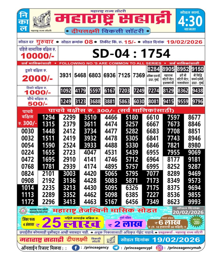 Maharashtra Sahyadri Weekly Lottery Result 19/02/26 19/02/26 Leave a Comment on Maharashtra Sahyadri Weekly Lottery Result 19/02/26 Share: XFacebookPinterestRedditVKDiggLinkedinMix Related Articles 0 135 Maharashtra Mohini Lottery Result 13/07/25 0 158 Maharashtra Sahyadri Weekly Lottery Result 22/12/25 0 199 Maharashtra Sahyadri Weekly Lottery Result 06/10/25 0 177 Maharashtra Sahyadri Weekly Lottery Result 13/11/25