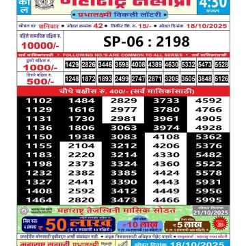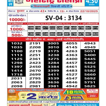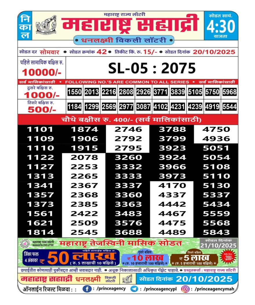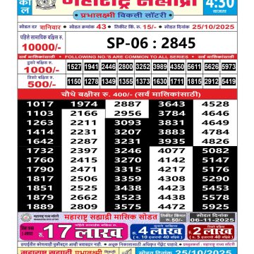 Maharashtra Sahyadri Weekly Lottery Result 20/10/25 20/10/25 Leave a Comment on Maharashtra Sahyadri Weekly Lottery Result 20/10/25 Share: XFacebookPinterestRedditVKDiggLinkedinMix Related Articles 0 64 Maharashtra Sahyadri Weekly Lottery Result 22/10/25 0 89 Maharashtra Sahyadri Weekly Lottery Result 18/10/25 0 29 Maharashtra Gajlaxmi lottery result 1/4/25 0 51 Maharashtra Sahyadri Weekly Lottery Result 25/10/25