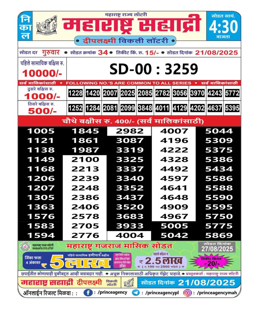 Maharashtra Sahyadri Weekly Lottery Result 21/08/25 21/08/25 Leave a Comment on Maharashtra Sahyadri Weekly Lottery Result 21/08/25 Share: XFacebookPinterestRedditVKDiggLinkedinMix Related Articles 0 102 Maharashtra Sahyadri Weekly Lottery Result 30/09/25 0 56 Maharashtra Sahyadri Weekly Lottery Result 17/5/25 0 25 Maharashtra mohini Lottery Result 6/4/25 0 99 Maharashtra Sahyadri Weekly Lottery Result 06/10/25