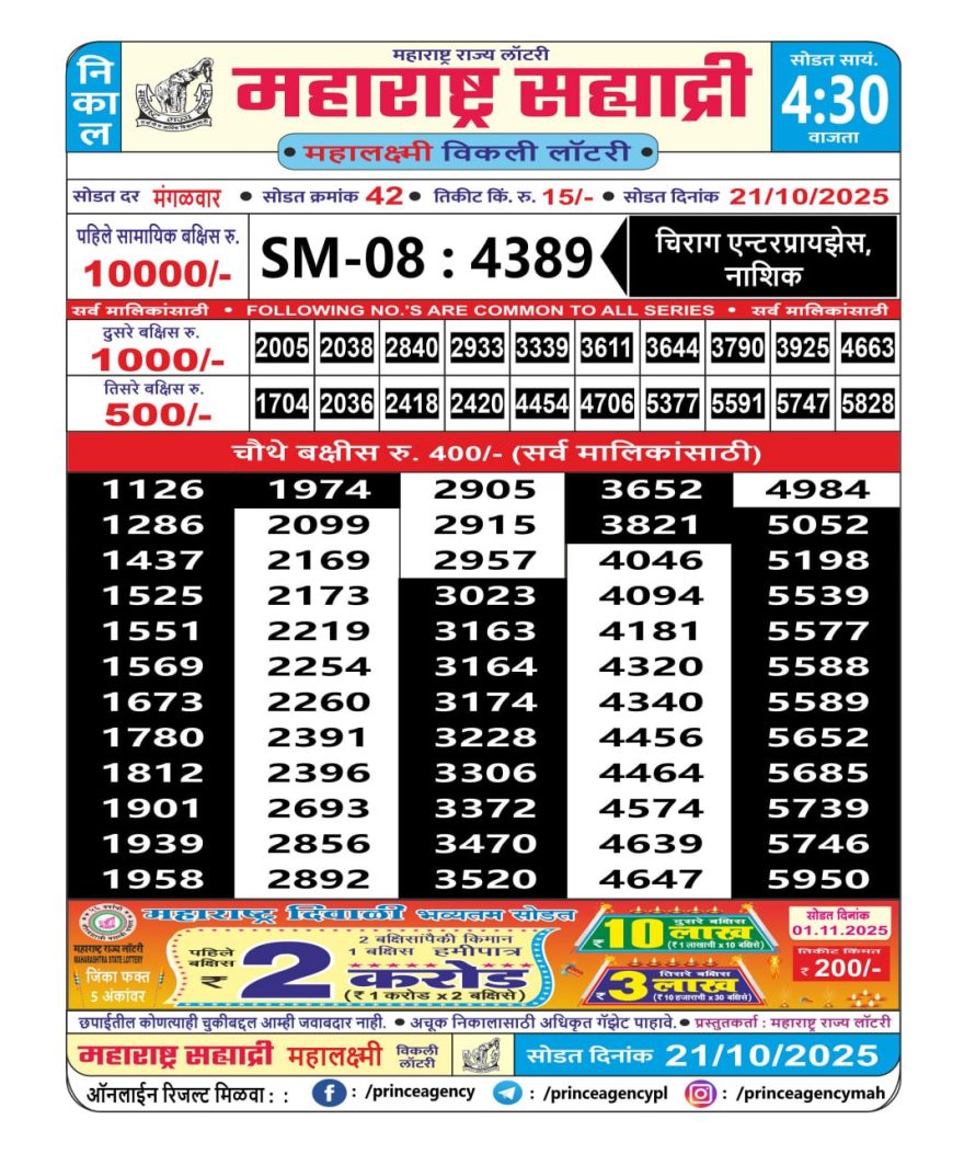 Maharashtra Sahyadri Weekly Lottery Result 21/10/25 21/10/25 Leave a Comment on Maharashtra Sahyadri Weekly Lottery Result 21/10/25 Share: XFacebookPinterestRedditVKDiggLinkedinMix Related Articles 0 31 Maharashtra Sahyadri Weekly Lottery Result 10/5/25 0 64 Maharashtra Sahyadri lottery result 6/3/25 0 40 Maharashtra Sahyadri Weekly Lottery Result 16/07/25 0 35 Maharashtra Sahyadri Weekly Lottery Result 20/06/25
