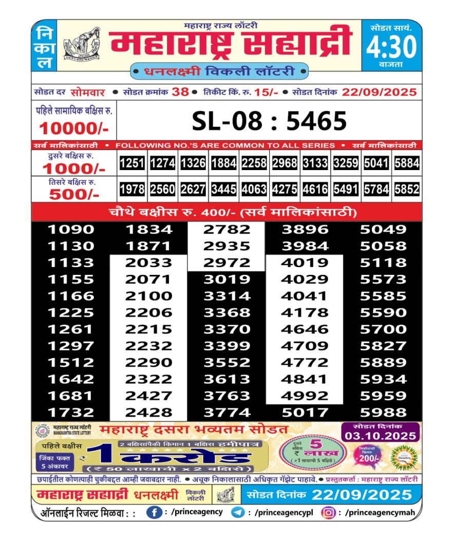 Maharashtra Sahyadri Weekly Lottery Result 22/09/25 22/09/25 Leave a Comment on Maharashtra Sahyadri Weekly Lottery Result 22/09/25 Share: XFacebookPinterestRedditVKDiggLinkedinMix Related Articles 0 51 Maharashtra Sahyadri Lottery Result 24/3/25 0 54 Maharashtra Sahyadri Weekly Lottery Result 06/06/25 0 49 Maharashtra Sahyadri Weekly Lottery Result 28/07/25 0 122 Maharashtra Sahyadri Weekly Lottery Result 24/09/25