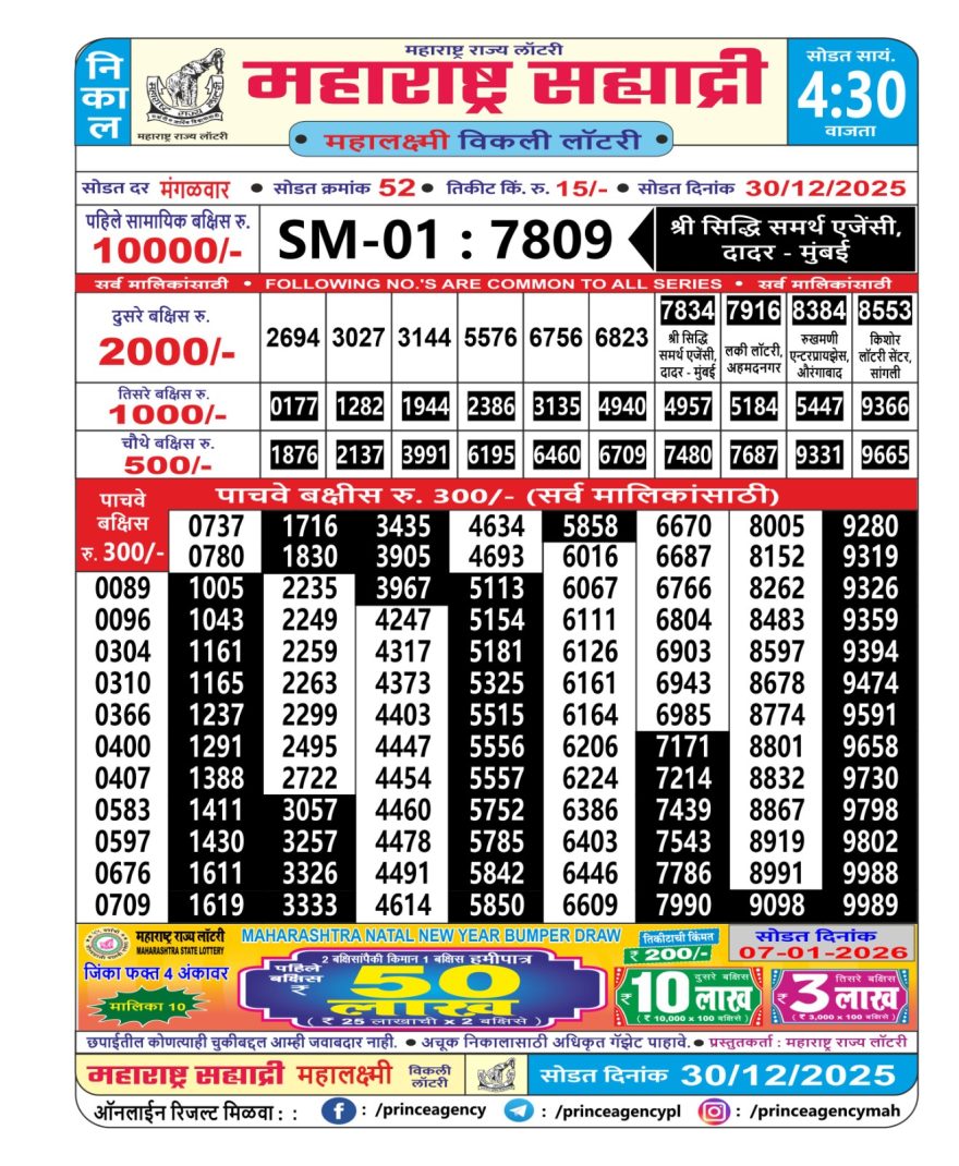 Maharashtra Sahyadri Weekly Lottery Result 30/12/25 30/12/25 Leave a Comment on Maharashtra Sahyadri Weekly Lottery Result 30/12/25 Share: XFacebookPinterestRedditVKDiggLinkedinMix Related Articles 0 117 Maharashtra Sahyadri Weekly Lottery Result 05/12/25 0 109 Maharashtra Mohini Lottery Result 10/08/25 0 50 Maharashtra Sahyadri Weekly Lottery Result 12/01/26 0 93 Maharashtra Sahyadri lottery result 18/3/25