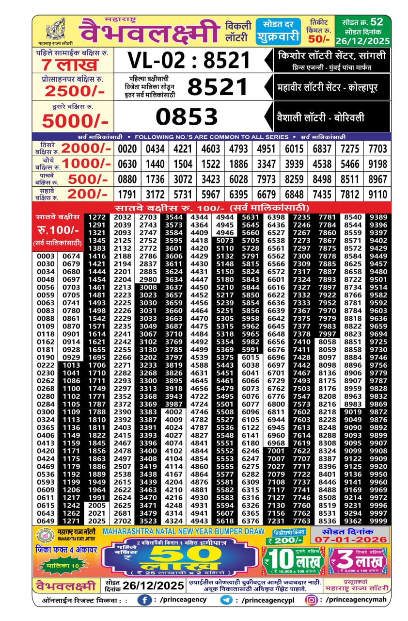 Maharashtra Vaibhav Laxmi Weekly Lottery Result 26/12/25 26/12/25 Leave a Comment on Maharashtra Vaibhav Laxmi Weekly Lottery Result 26/12/25 Share: XFacebookPinterestRedditVKDiggLinkedinMix Related Articles 0 173 Maharashtra akshay weekly lottery result 23/4/25 0 141 Maharashtra Laxmi Weekly Lottery Result 1/3/25 0 151 Maharashtra Akarshak Weekly Lottery Result 21/08/25 0 191 Maharashtra Sagar Laxmi Weekly Lottery Result 26/05/25