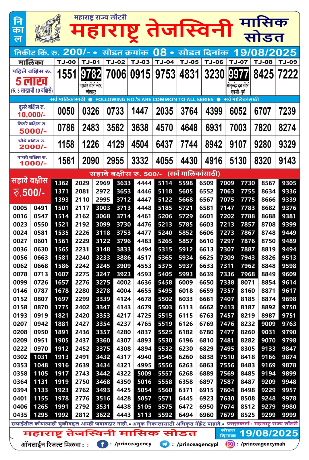 Maharashtra Tejaswini monthly lottery result 19.08.25 live