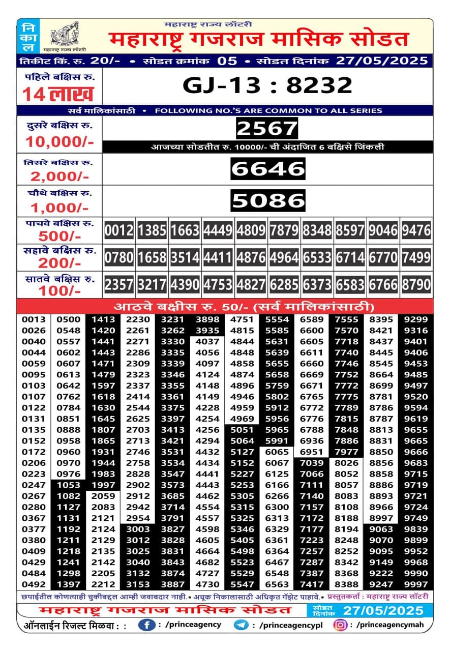 Maharashtra Gajraj monthly lottery result 27/05/25